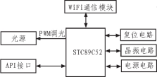 教室智能照明系统能对教室内所有灯光进行监控和管理,终端控制节点替代传统的机械开关,利用单片机STC89C52产生一个PWM波实现对亮度控制。终端控制节点设计框图如图2所示。PWM调光(Pulse Width Modulation Dimming)实现脉宽制调光,通过利用频率超过100 Hz的亮度闪烁而肉眼难以发现的闪烁频率这一特性,只要通过控制LED灯开通和断开时间的占空比,来实现改变LED流过的平均电流,最终实现亮度的控制。采用WIFI通信模块来确保控制指令的可靠传输,提高数据传输可靠性。