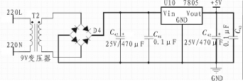 其中,STC89C52采用5 V的供电电压。其电源电路原理图如图3所示。直流稳压电源通常由四部分构成:变压器降压模块、整流电路、滤波电路以及稳压电路。将220 V的交流电通过降压变压器进行降压后,再通过单相桥式整流电路得到脉动的直流电压,然后通过滤波电容得到纹波系数较小的直流电压,最后通过三端稳压芯片LM7805获得稳定的5 V直流电压。