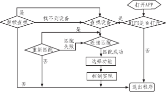 而在智能手机终端,当打开APP时,手机会自动检测WiFi是否已经打开,是的话则会查找设备,否则会退出程序;当查找设备时,没有找到设备则会继续查找,直到找到为止,找到设备则会连接匹配;匹配成功则可以选择功能并控制实现,然后退出程序。程序流程图如图5所示。